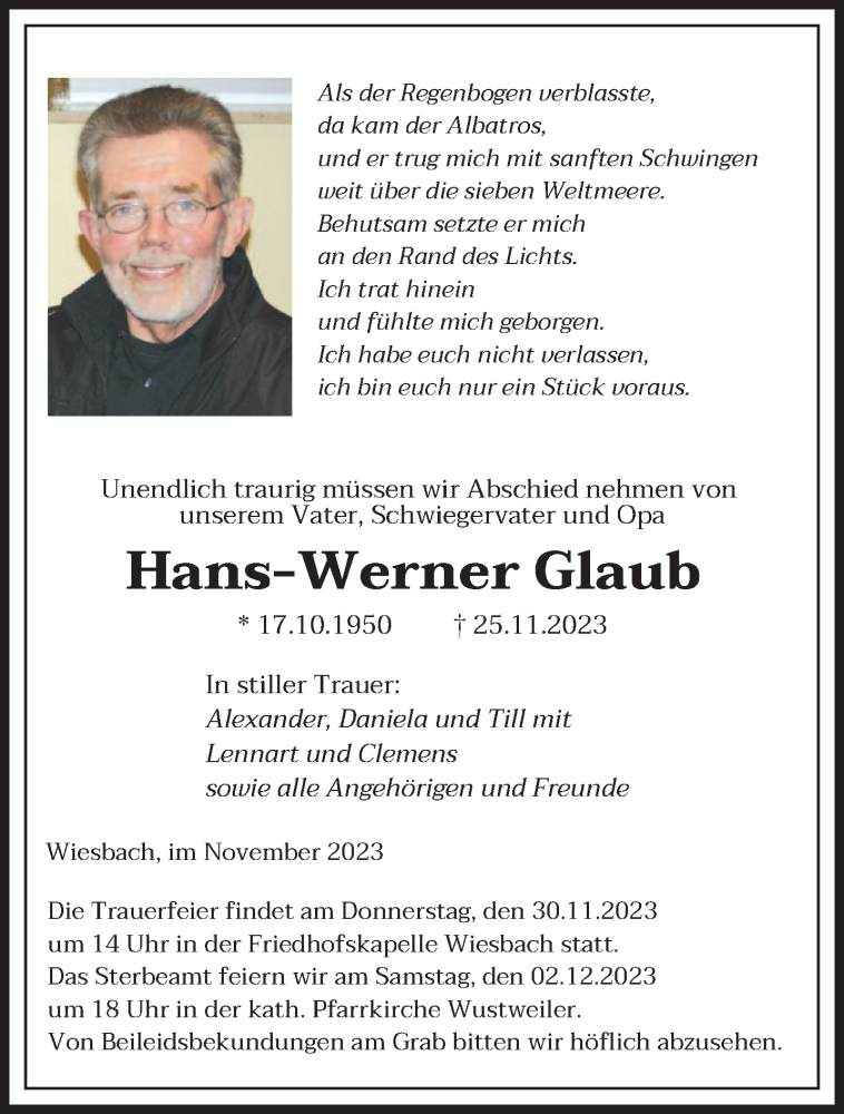 Hier finden Sie alle Traueranzeigen aus der Zeitung, die bisher für Hans-Werner Glaub erschienen sind. Weitere Traueranzeigen, die in der Zeitung erscheinen, werden hier ebenfalls aufgelistet