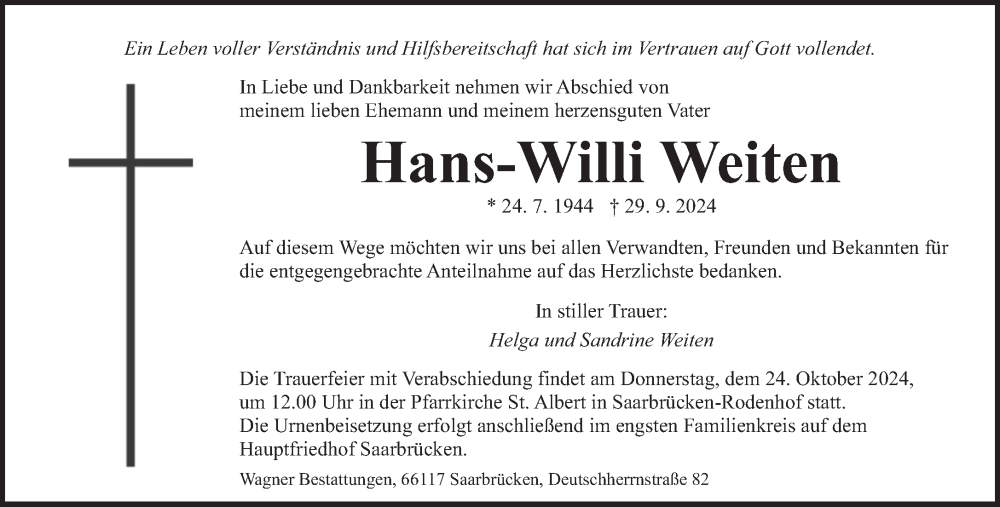 Hier finden Sie alle Traueranzeigen aus der Zeitung, die bisher für Hans-Willi Weiten erschienen sind. Weitere Traueranzeigen, die in der Zeitung erscheinen, werden hier ebenfalls aufgelistet