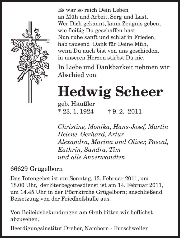 Hier finden Sie alle Traueranzeigen aus der Zeitung, die bisher für Hedwig Scheer erschienen sind. Weitere Traueranzeigen, die in der Zeitung erscheinen, werden hier ebenfalls aufgelistet