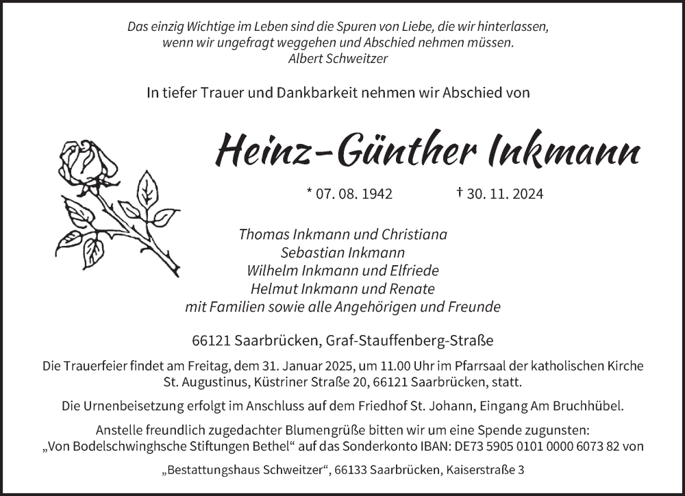 Hier finden Sie alle Traueranzeigen aus der Zeitung, die bisher für Heinz-Günther Inkmann erschienen sind. Weitere Traueranzeigen, die in der Zeitung erscheinen, werden hier ebenfalls aufgelistet