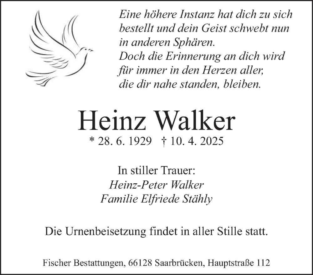 Hier finden Sie alle Traueranzeigen aus der Zeitung, die bisher für Heinz Walker erschienen sind. Weitere Traueranzeigen, die in der Zeitung erscheinen, werden hier ebenfalls aufgelistet