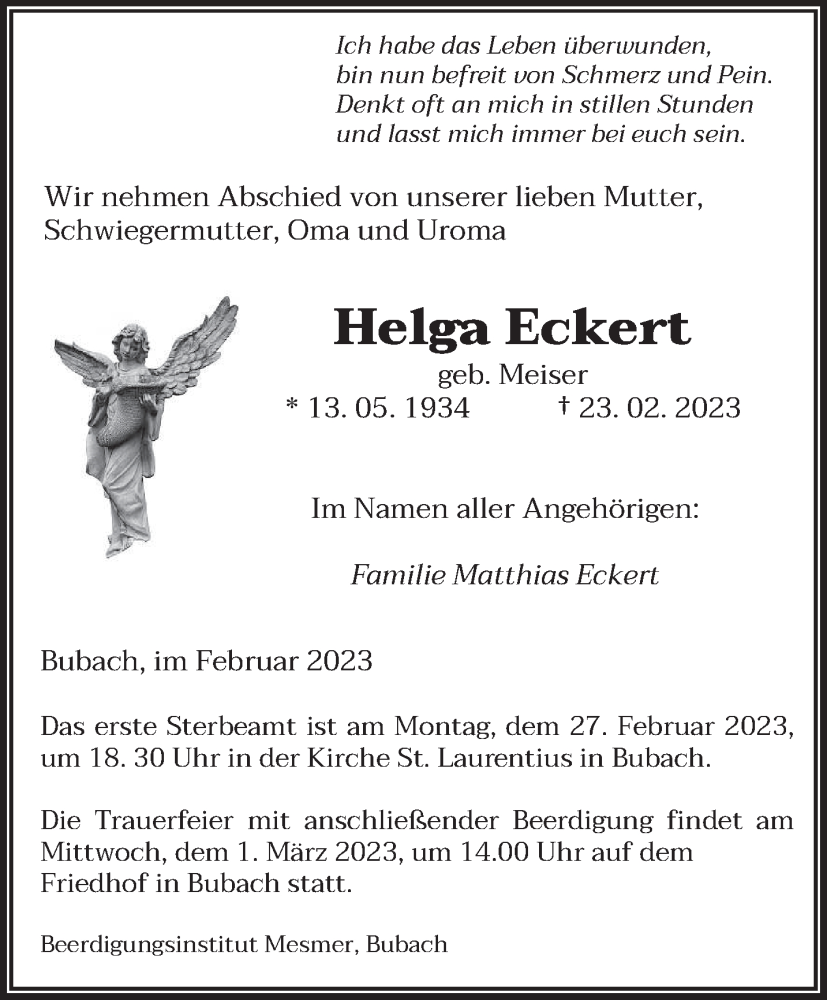 Hier finden Sie alle Traueranzeigen aus der Zeitung, die bisher für Helga Eckert erschienen sind. Weitere Traueranzeigen, die in der Zeitung erscheinen, werden hier ebenfalls aufgelistet