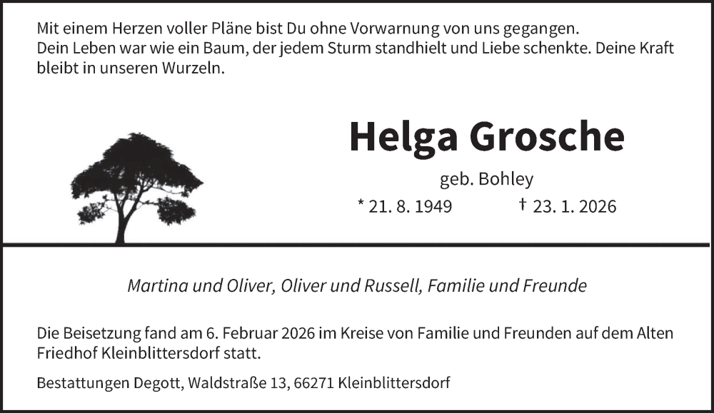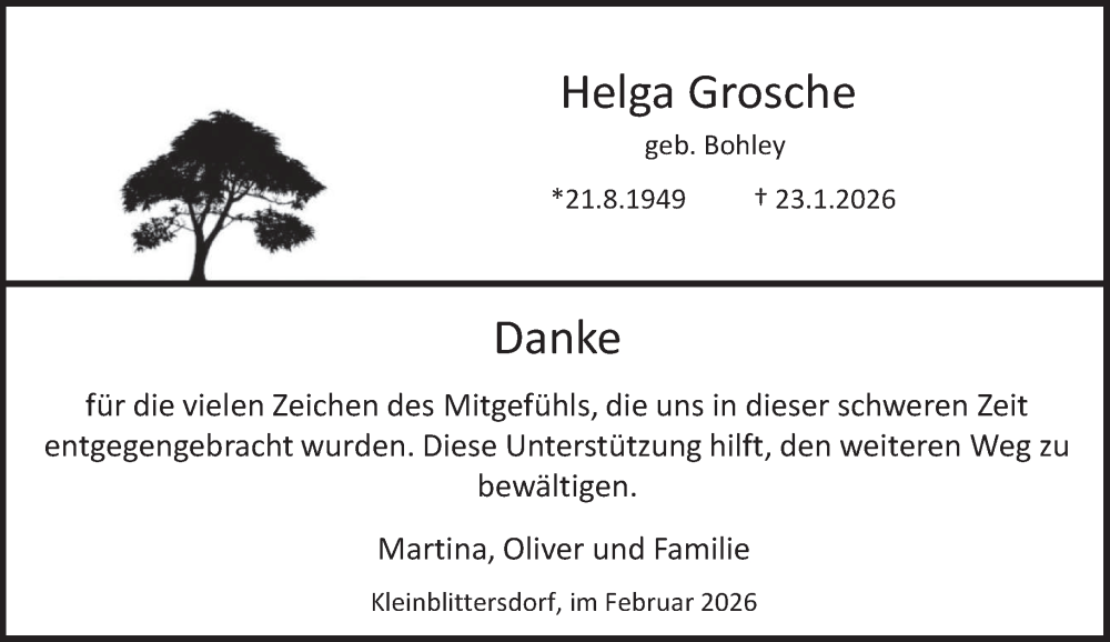 Hier finden Sie alle Traueranzeigen aus der Zeitung, die bisher für Helga Grosche erschienen sind. Weitere Traueranzeigen, die in der Zeitung erscheinen, werden hier ebenfalls aufgelistet