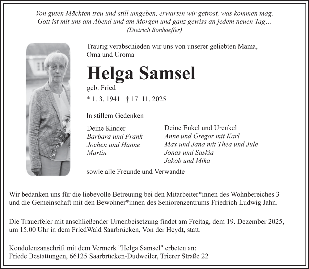 Hier finden Sie alle Traueranzeigen aus der Zeitung, die bisher für Helga Samsel erschienen sind. Weitere Traueranzeigen, die in der Zeitung erscheinen, werden hier ebenfalls aufgelistet