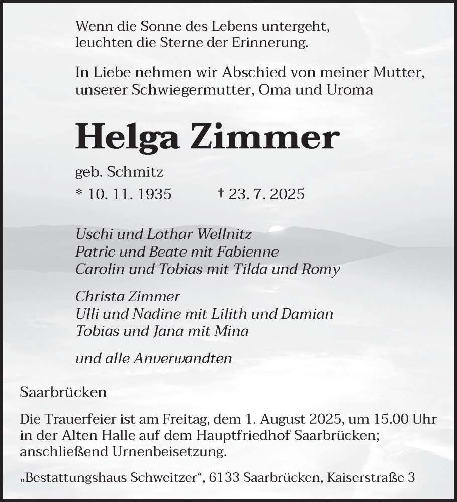 Hier finden Sie alle Traueranzeigen aus der Zeitung, die bisher für Helga Zimmer erschienen sind. Weitere Traueranzeigen, die in der Zeitung erscheinen, werden hier ebenfalls aufgelistet
