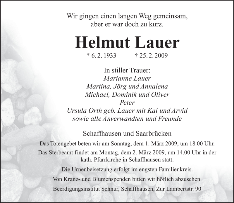 Hier finden Sie alle Traueranzeigen aus der Zeitung, die bisher für Helmut Lauer erschienen sind. Weitere Traueranzeigen, die in der Zeitung erscheinen, werden hier ebenfalls aufgelistet