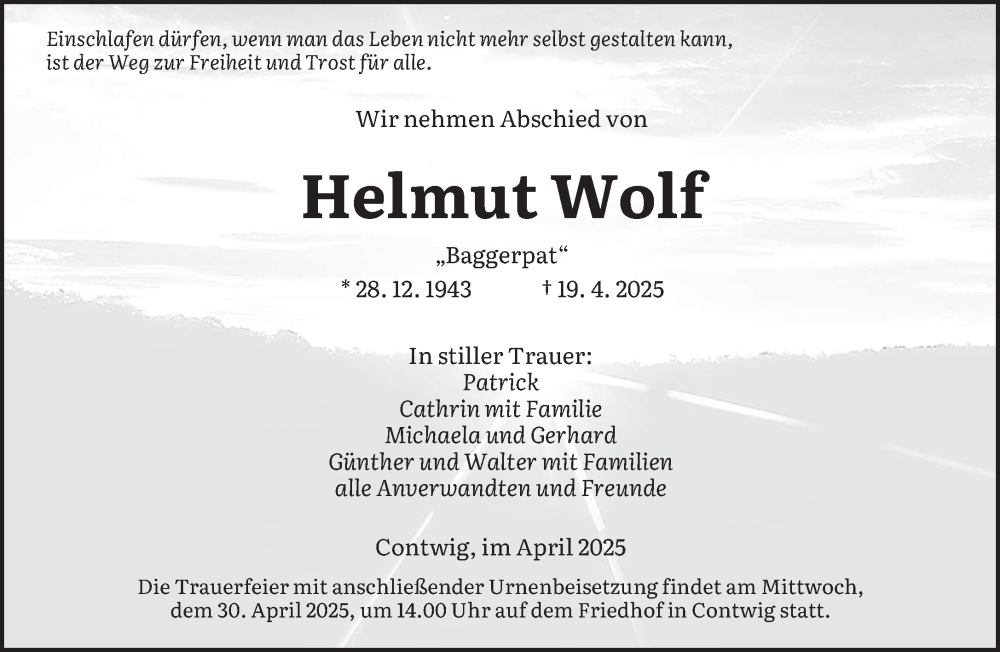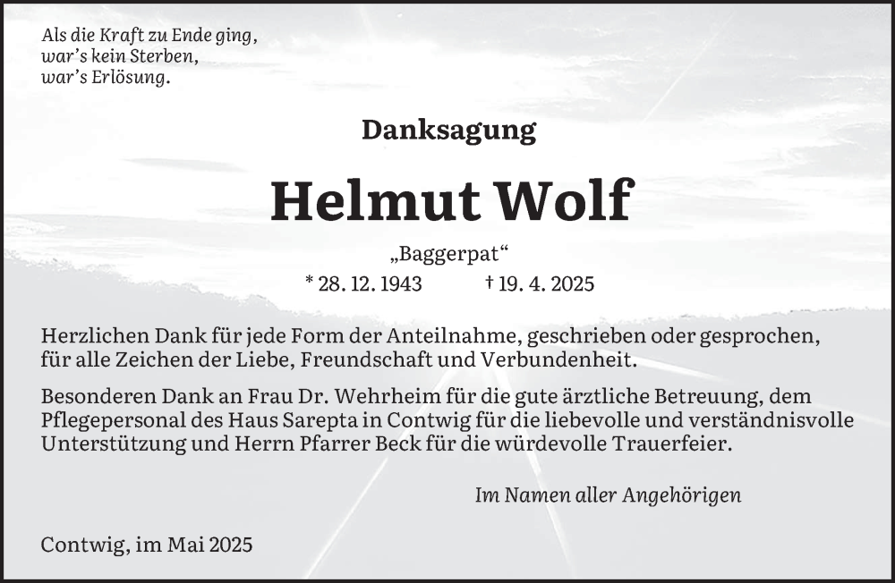 Hier finden Sie alle Traueranzeigen aus der Zeitung, die bisher für Helmut Wolf erschienen sind. Weitere Traueranzeigen, die in der Zeitung erscheinen, werden hier ebenfalls aufgelistet