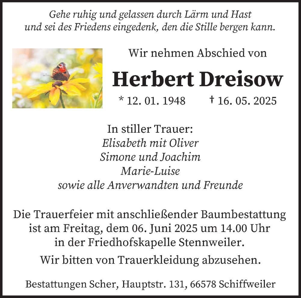 Hier finden Sie alle Traueranzeigen aus der Zeitung, die bisher für Herbert Dreisow erschienen sind. Weitere Traueranzeigen, die in der Zeitung erscheinen, werden hier ebenfalls aufgelistet