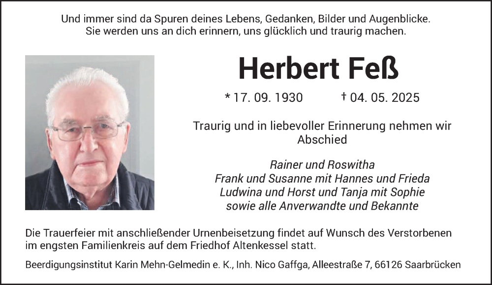Hier finden Sie alle Traueranzeigen aus der Zeitung, die bisher für Herbert Feß erschienen sind. Weitere Traueranzeigen, die in der Zeitung erscheinen, werden hier ebenfalls aufgelistet