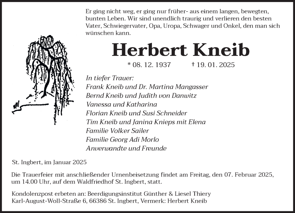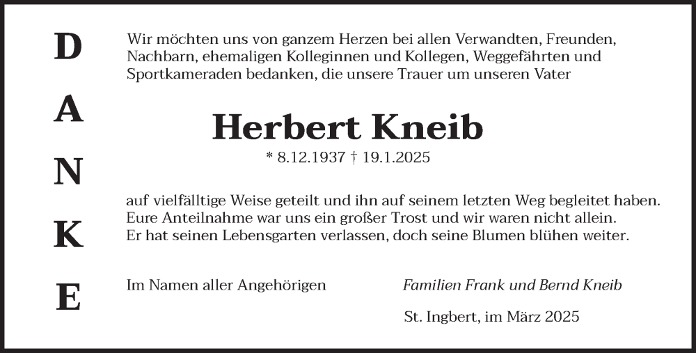 Hier finden Sie alle Traueranzeigen aus der Zeitung, die bisher für Herbert Kneib erschienen sind. Weitere Traueranzeigen, die in der Zeitung erscheinen, werden hier ebenfalls aufgelistet
