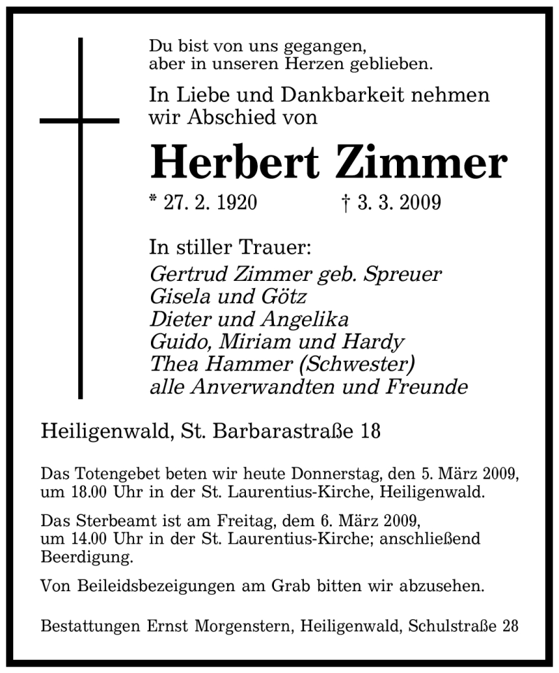 Hier finden Sie alle Traueranzeigen aus der Zeitung, die bisher für Herbert Zimmer erschienen sind. Weitere Traueranzeigen, die in der Zeitung erscheinen, werden hier ebenfalls aufgelistet