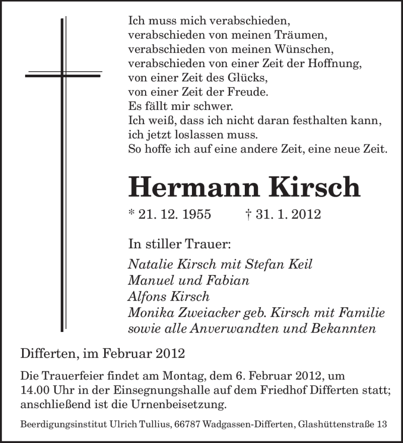 Hier finden Sie alle Traueranzeigen aus der Zeitung, die bisher für Hermann Kirsch erschienen sind. Weitere Traueranzeigen, die in der Zeitung erscheinen, werden hier ebenfalls aufgelistet