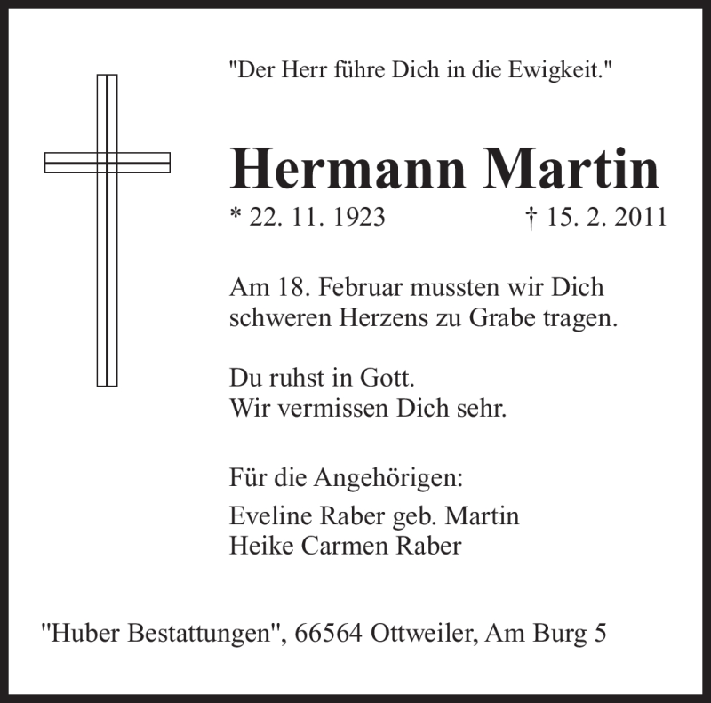 Hier finden Sie alle Traueranzeigen aus der Zeitung, die bisher für Hermann Martin erschienen sind. Weitere Traueranzeigen, die in der Zeitung erscheinen, werden hier ebenfalls aufgelistet