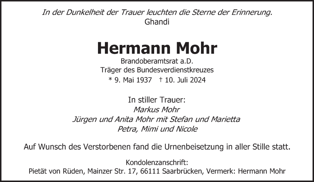 Hier finden Sie alle Traueranzeigen aus der Zeitung, die bisher für Hermann Mohr erschienen sind. Weitere Traueranzeigen, die in der Zeitung erscheinen, werden hier ebenfalls aufgelistet