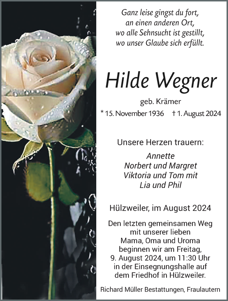 Hier finden Sie alle Traueranzeigen aus der Zeitung, die bisher für Hilde Wegner erschienen sind. Weitere Traueranzeigen, die in der Zeitung erscheinen, werden hier ebenfalls aufgelistet