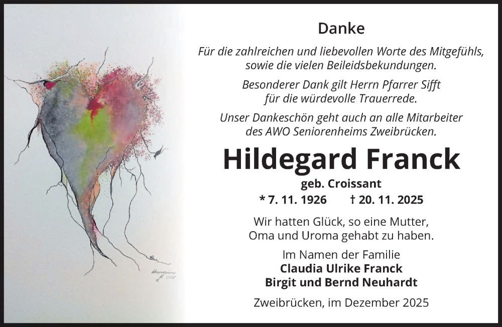Hier finden Sie alle Traueranzeigen aus der Zeitung, die bisher für Hildegard Franck erschienen sind. Weitere Traueranzeigen, die in der Zeitung erscheinen, werden hier ebenfalls aufgelistet