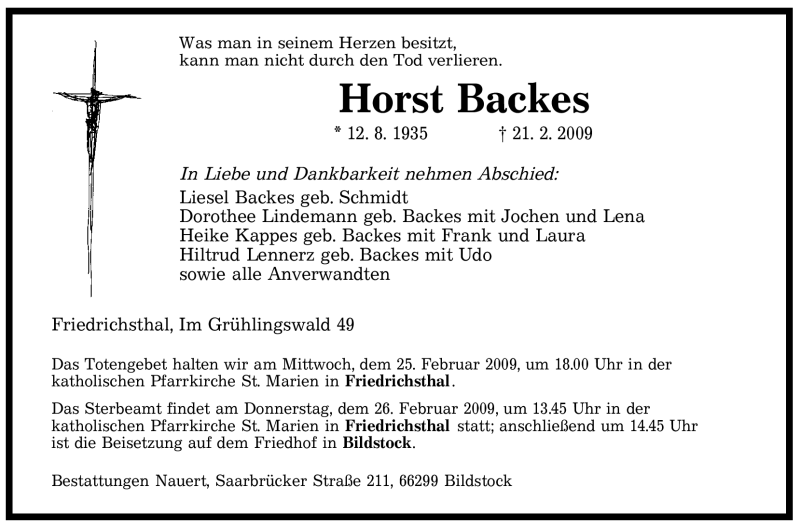 Hier finden Sie alle Traueranzeigen aus der Zeitung, die bisher für Horst Backes erschienen sind. Weitere Traueranzeigen, die in der Zeitung erscheinen, werden hier ebenfalls aufgelistet