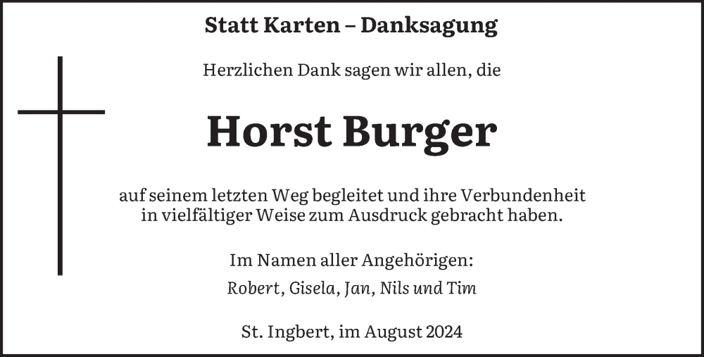 Hier finden Sie alle Traueranzeigen aus der Zeitung, die bisher für Horst Burger erschienen sind. Weitere Traueranzeigen, die in der Zeitung erscheinen, werden hier ebenfalls aufgelistet