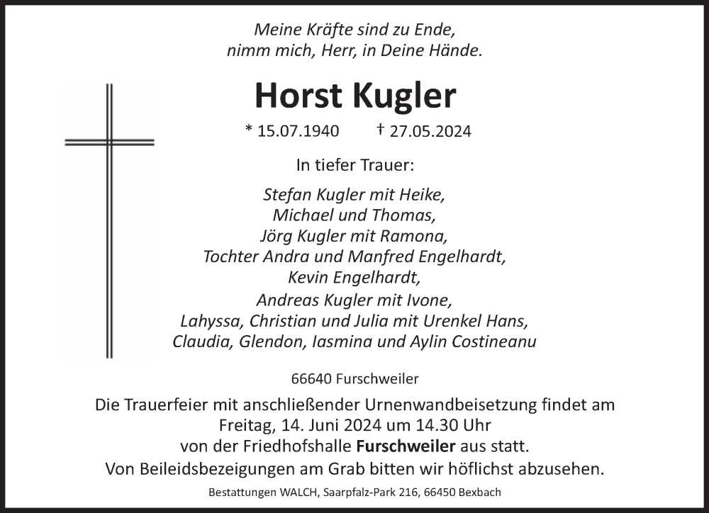 Hier finden Sie alle Traueranzeigen aus der Zeitung, die bisher für Horst Kugler erschienen sind. Weitere Traueranzeigen, die in der Zeitung erscheinen, werden hier ebenfalls aufgelistet