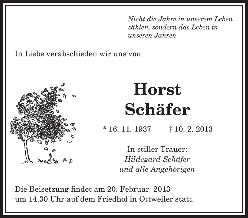 Hier finden Sie alle Traueranzeigen aus der Zeitung, die bisher für Horst Schäfer erschienen sind. Weitere Traueranzeigen, die in der Zeitung erscheinen, werden hier ebenfalls aufgelistet