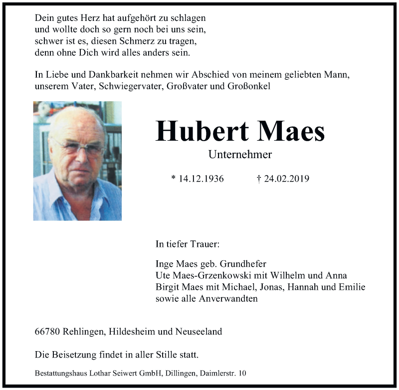 Hier finden Sie alle Traueranzeigen aus der Zeitung, die bisher für Hubert Maes erschienen sind. Weitere Traueranzeigen, die in der Zeitung erscheinen, werden hier ebenfalls aufgelistet