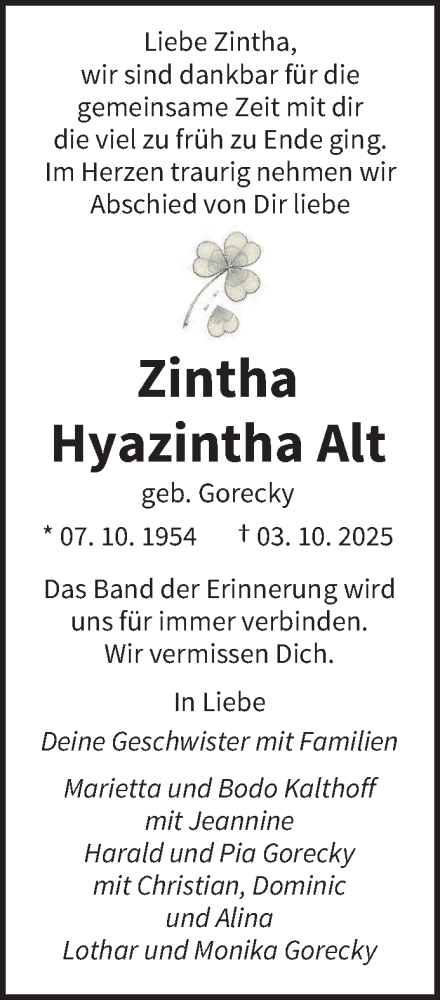 Hier finden Sie alle Traueranzeigen aus der Zeitung, die bisher für Hyazintha Alt erschienen sind. Weitere Traueranzeigen, die in der Zeitung erscheinen, werden hier ebenfalls aufgelistet