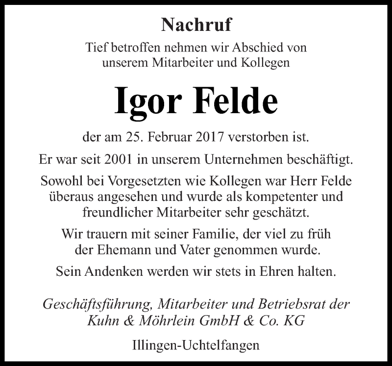 Hier finden Sie alle Traueranzeigen aus der Zeitung, die bisher für Igor Felde erschienen sind. Weitere Traueranzeigen, die in der Zeitung erscheinen, werden hier ebenfalls aufgelistet