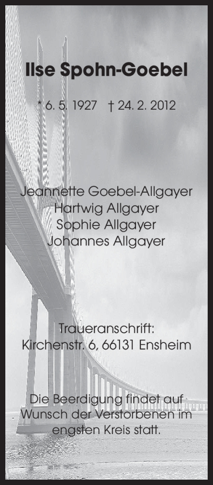 Hier finden Sie alle Traueranzeigen aus der Zeitung, die bisher für Ilse Spohn-Goebel erschienen sind. Weitere Traueranzeigen, die in der Zeitung erscheinen, werden hier ebenfalls aufgelistet
