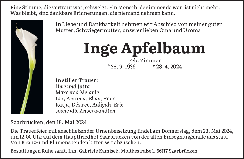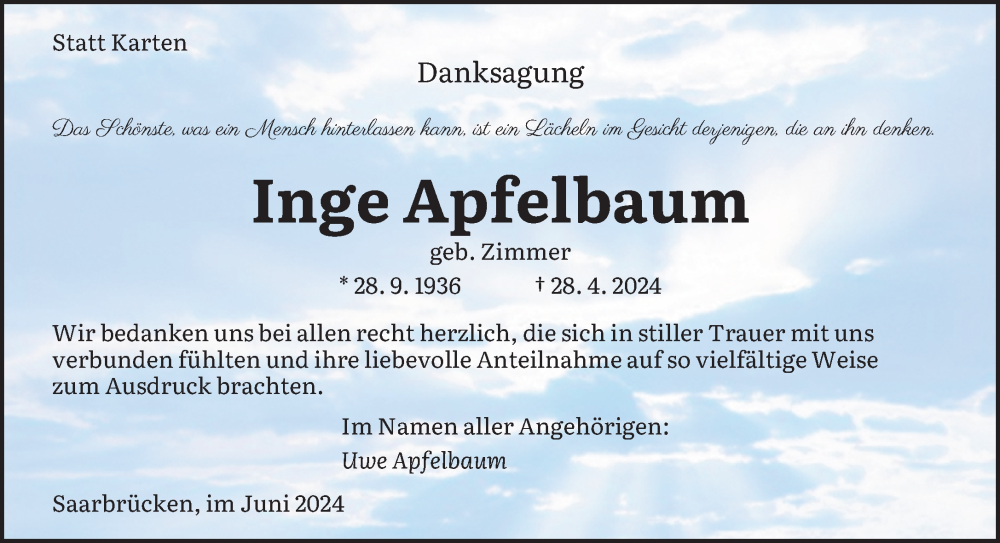 Hier finden Sie alle Traueranzeigen aus der Zeitung, die bisher für Inge Apfelbaum erschienen sind. Weitere Traueranzeigen, die in der Zeitung erscheinen, werden hier ebenfalls aufgelistet