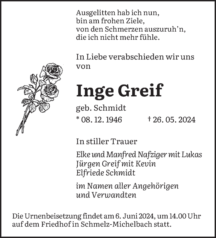 Hier finden Sie alle Traueranzeigen aus der Zeitung, die bisher für Inge Greif erschienen sind. Weitere Traueranzeigen, die in der Zeitung erscheinen, werden hier ebenfalls aufgelistet