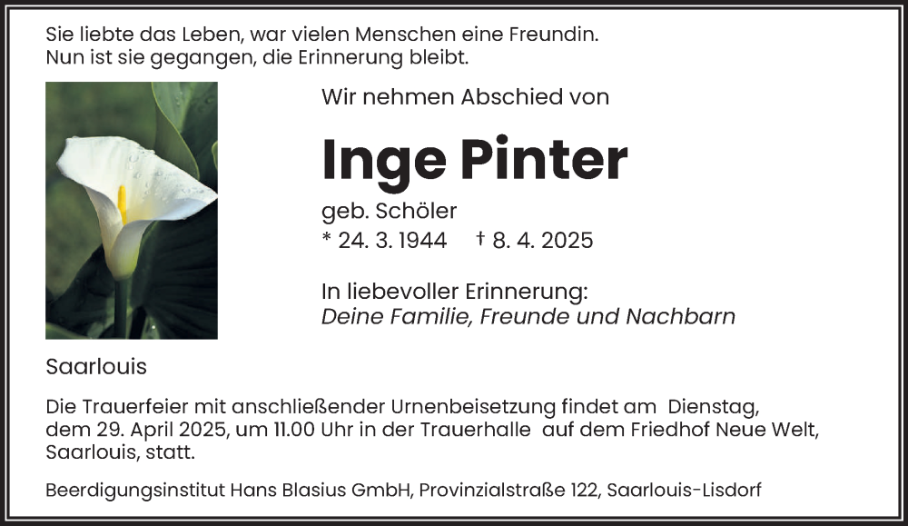Hier finden Sie alle Traueranzeigen aus der Zeitung, die bisher für Inge Pinter erschienen sind. Weitere Traueranzeigen, die in der Zeitung erscheinen, werden hier ebenfalls aufgelistet
