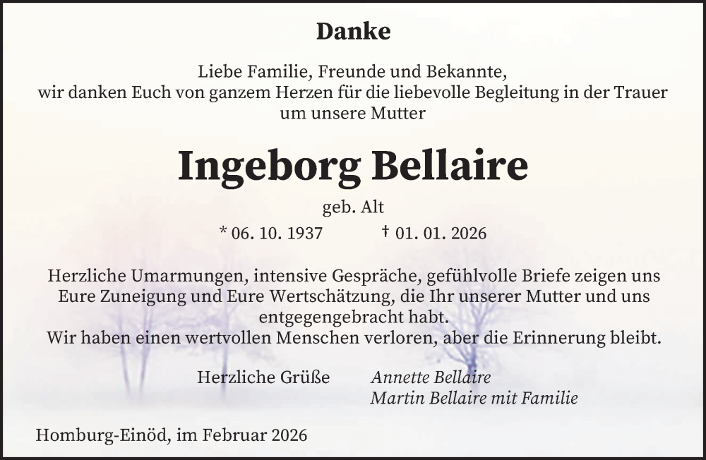 Hier finden Sie alle Traueranzeigen aus der Zeitung, die bisher für Ingeborg Bellaire erschienen sind. Weitere Traueranzeigen, die in der Zeitung erscheinen, werden hier ebenfalls aufgelistet
