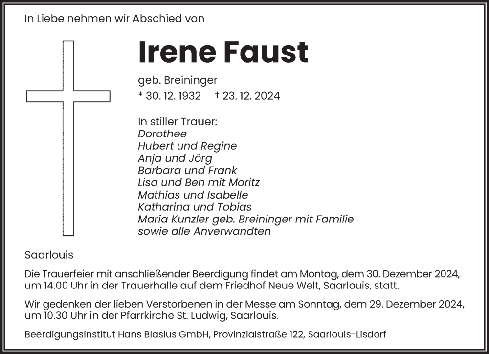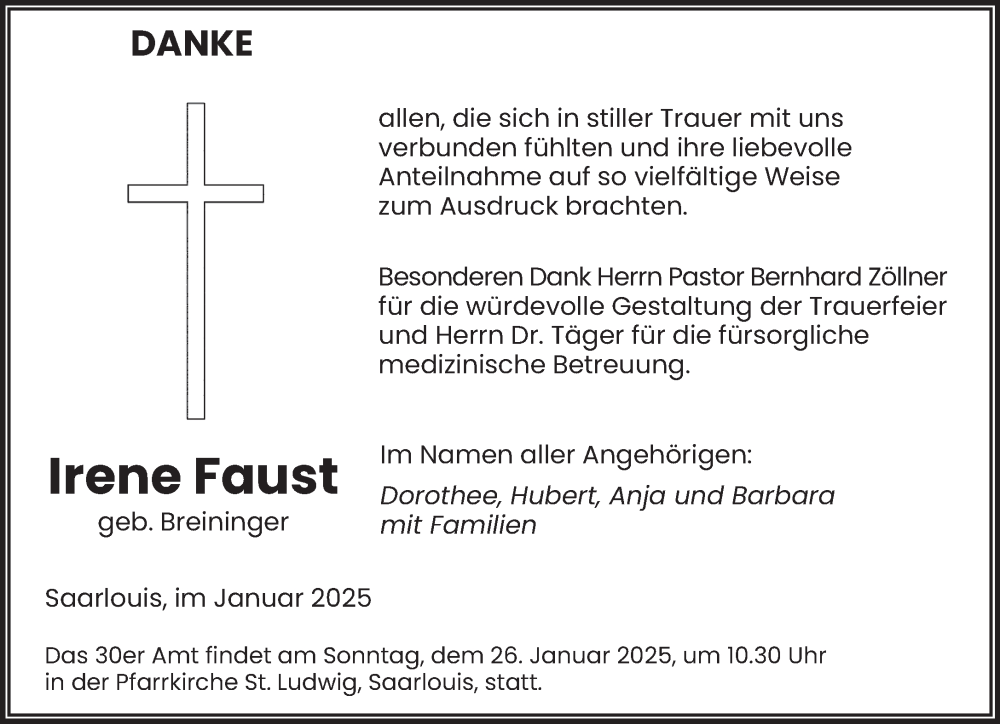 Hier finden Sie alle Traueranzeigen aus der Zeitung, die bisher für Irene Faust erschienen sind. Weitere Traueranzeigen, die in der Zeitung erscheinen, werden hier ebenfalls aufgelistet