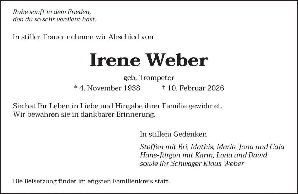 Hier finden Sie alle Traueranzeigen aus der Zeitung, die bisher für Irene Weber erschienen sind. Weitere Traueranzeigen, die in der Zeitung erscheinen, werden hier ebenfalls aufgelistet