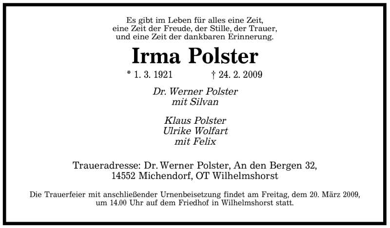 Hier finden Sie alle Traueranzeigen aus der Zeitung, die bisher für Irma Polster erschienen sind. Weitere Traueranzeigen, die in der Zeitung erscheinen, werden hier ebenfalls aufgelistet