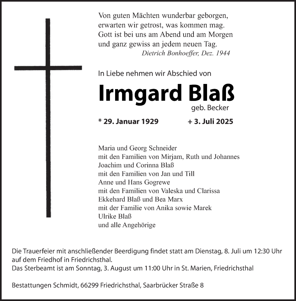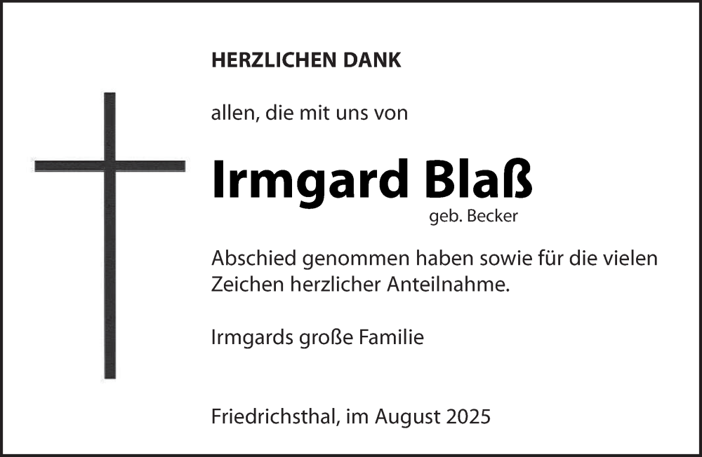 Hier finden Sie alle Traueranzeigen aus der Zeitung, die bisher für Irmgard Blaß erschienen sind. Weitere Traueranzeigen, die in der Zeitung erscheinen, werden hier ebenfalls aufgelistet