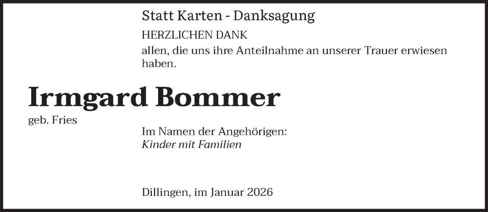 Hier finden Sie alle Traueranzeigen aus der Zeitung, die bisher für Irmgard Bommer erschienen sind. Weitere Traueranzeigen, die in der Zeitung erscheinen, werden hier ebenfalls aufgelistet