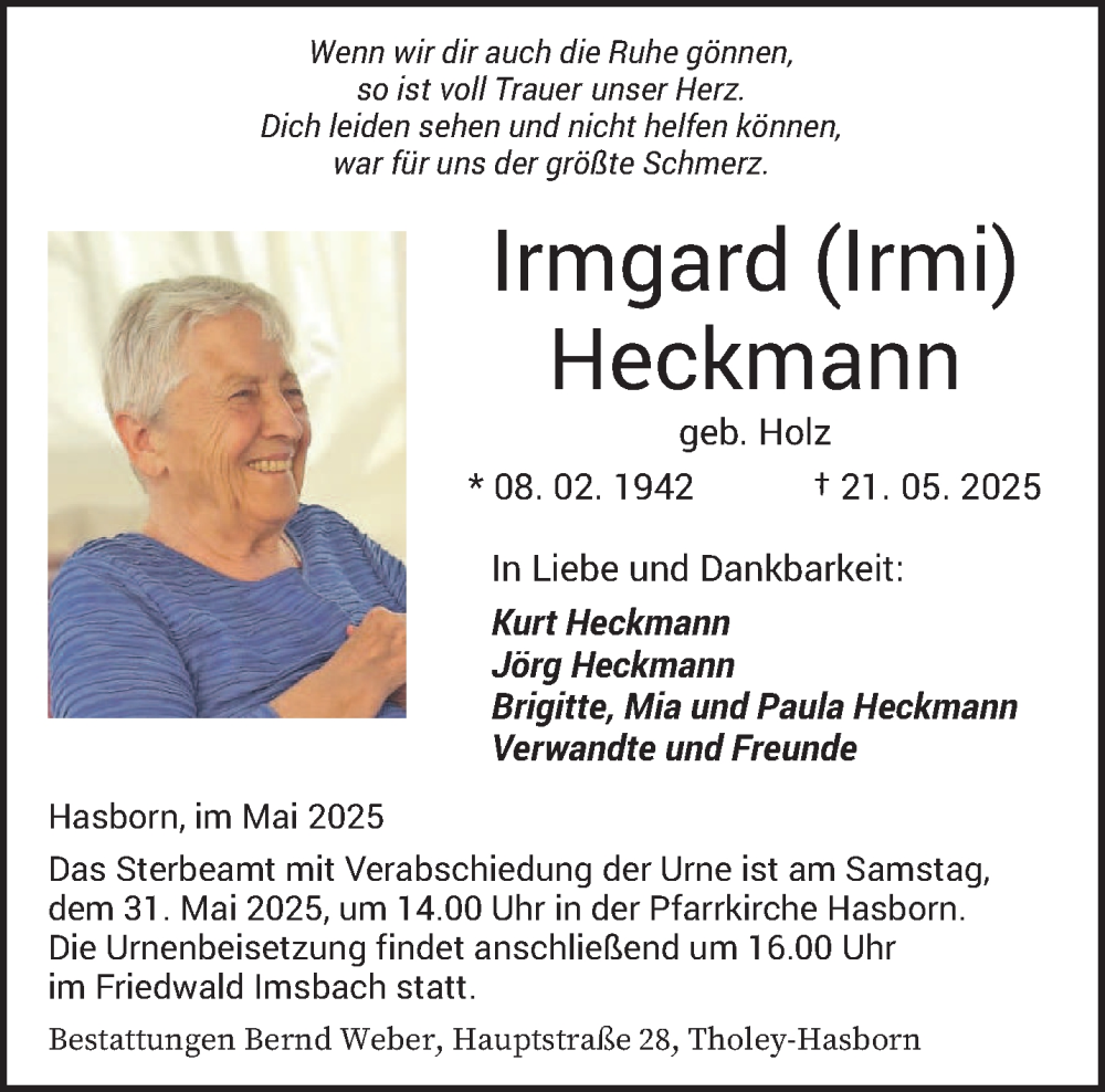 Hier finden Sie alle Traueranzeigen aus der Zeitung, die bisher für Irmgard Heckmann erschienen sind. Weitere Traueranzeigen, die in der Zeitung erscheinen, werden hier ebenfalls aufgelistet