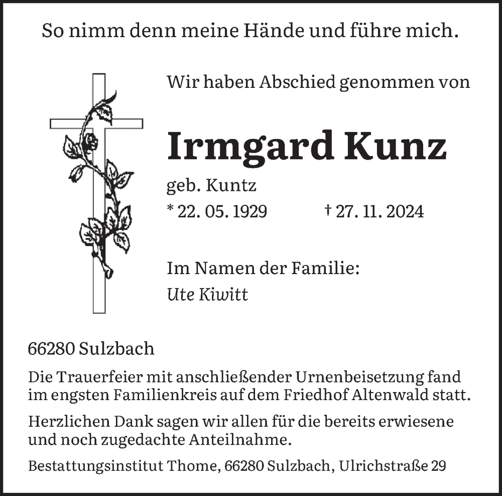 Hier finden Sie alle Traueranzeigen aus der Zeitung, die bisher für Irmgard Kunz erschienen sind. Weitere Traueranzeigen, die in der Zeitung erscheinen, werden hier ebenfalls aufgelistet