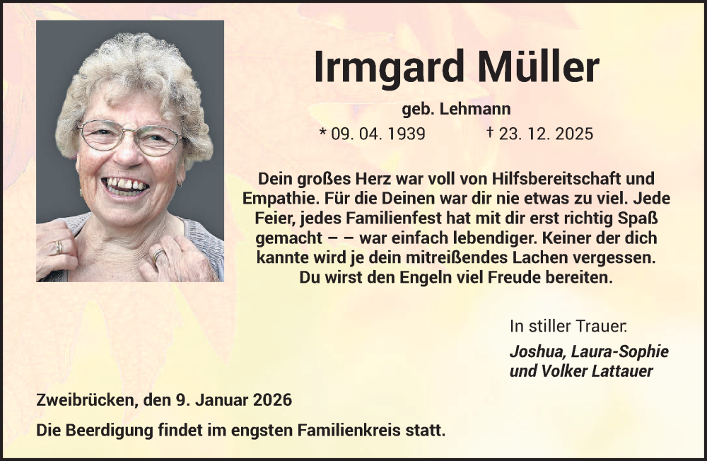 Hier finden Sie alle Traueranzeigen aus der Zeitung, die bisher für Irmgard Müller erschienen sind. Weitere Traueranzeigen, die in der Zeitung erscheinen, werden hier ebenfalls aufgelistet