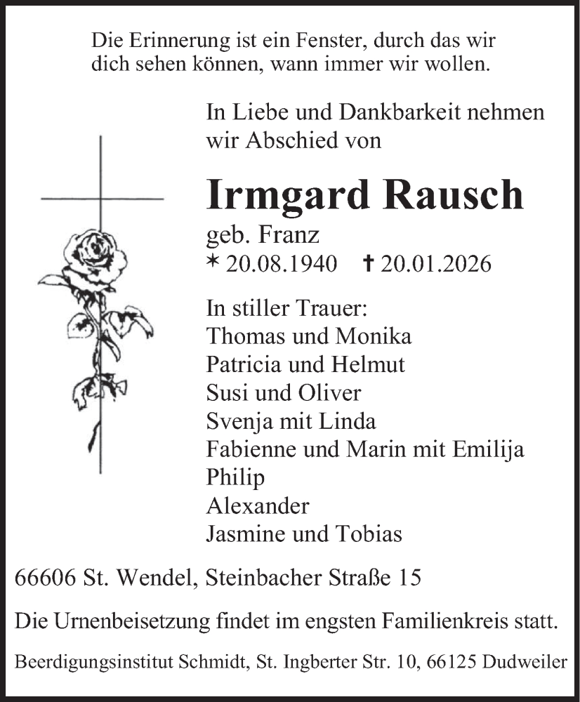 Hier finden Sie alle Traueranzeigen aus der Zeitung, die bisher für Irmgard Rausch erschienen sind. Weitere Traueranzeigen, die in der Zeitung erscheinen, werden hier ebenfalls aufgelistet