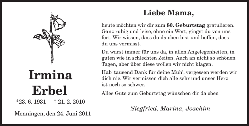 Hier finden Sie alle Traueranzeigen aus der Zeitung, die bisher für Irmina Erbel erschienen sind. Weitere Traueranzeigen, die in der Zeitung erscheinen, werden hier ebenfalls aufgelistet