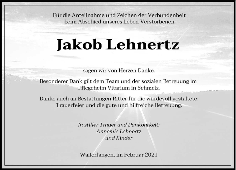 Hier finden Sie alle Traueranzeigen aus der Zeitung, die bisher für Jakob Lehnertz erschienen sind. Weitere Traueranzeigen, die in der Zeitung erscheinen, werden hier ebenfalls aufgelistet