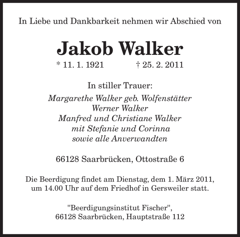 Hier finden Sie alle Traueranzeigen aus der Zeitung, die bisher für Jakob Walker erschienen sind. Weitere Traueranzeigen, die in der Zeitung erscheinen, werden hier ebenfalls aufgelistet