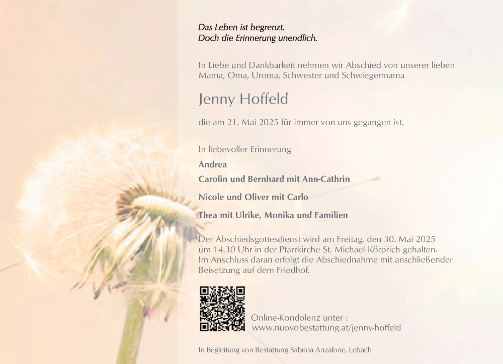 Hier finden Sie alle Traueranzeigen aus der Zeitung, die bisher für Jenny Hoffeld erschienen sind. Weitere Traueranzeigen, die in der Zeitung erscheinen, werden hier ebenfalls aufgelistet