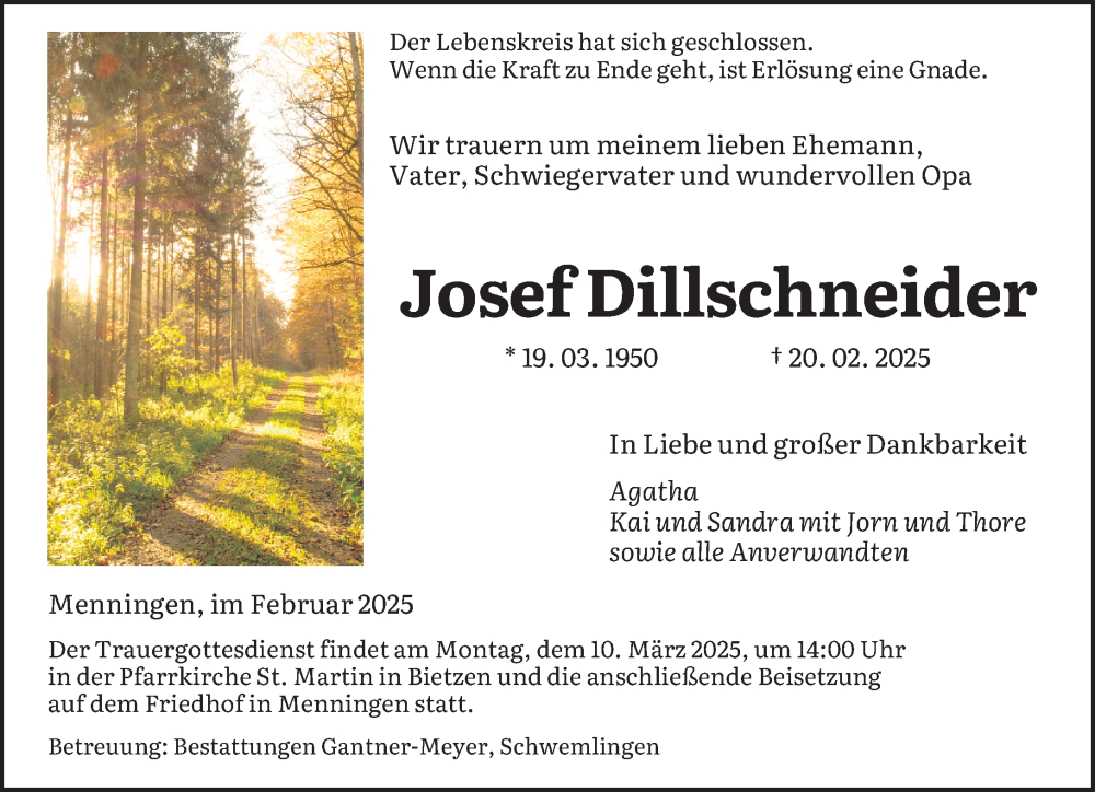 Hier finden Sie alle Traueranzeigen aus der Zeitung, die bisher für Josef Dillschneider erschienen sind. Weitere Traueranzeigen, die in der Zeitung erscheinen, werden hier ebenfalls aufgelistet