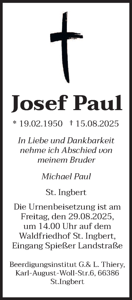 Hier finden Sie alle Traueranzeigen aus der Zeitung, die bisher für Josef Paul erschienen sind. Weitere Traueranzeigen, die in der Zeitung erscheinen, werden hier ebenfalls aufgelistet