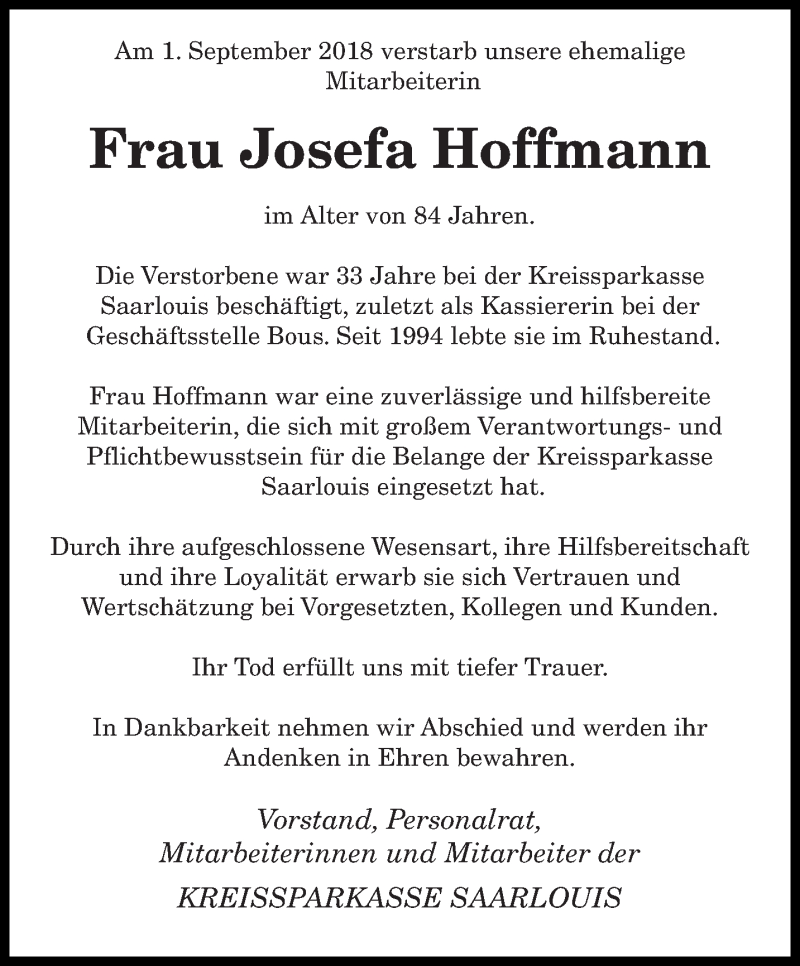 Hier finden Sie alle Traueranzeigen aus der Zeitung, die bisher für Josefa Hoffmann erschienen sind. Weitere Traueranzeigen, die in der Zeitung erscheinen, werden hier ebenfalls aufgelistet