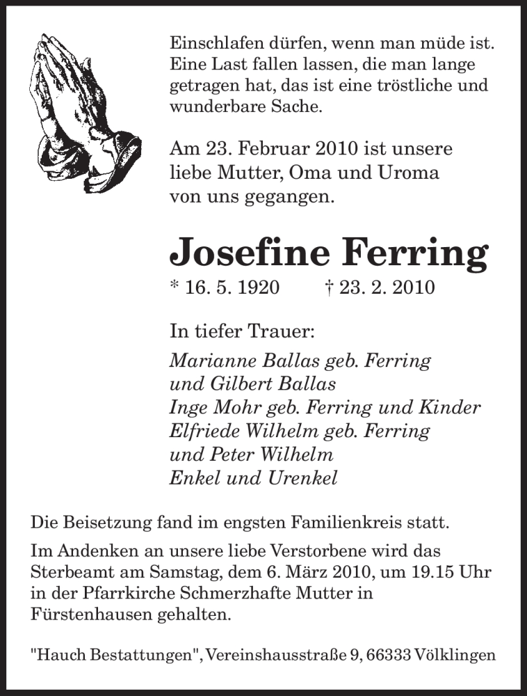 Hier finden Sie alle Traueranzeigen aus der Zeitung, die bisher für Josefine Ferring erschienen sind. Weitere Traueranzeigen, die in der Zeitung erscheinen, werden hier ebenfalls aufgelistet