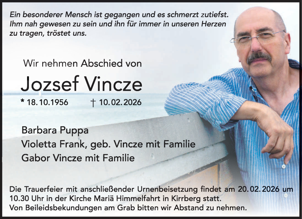 Hier finden Sie alle Traueranzeigen aus der Zeitung, die bisher für Jozsef Vincze erschienen sind. Weitere Traueranzeigen, die in der Zeitung erscheinen, werden hier ebenfalls aufgelistet
